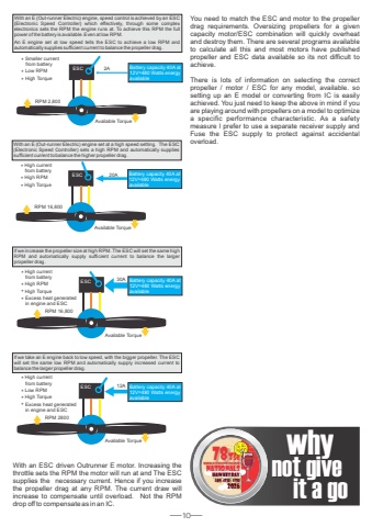 10With an ESC driven Outrunner E motor. Increasing the throttle sets the RPM the motor will run at and The ESCsupplies the necessary current. Hence if you increase the propeller drag at any RPM. The current draw will increase to compensate until overload. Not the RPMdrop off to compensate as in an IC.2A20A30A12A Smaller current* from battery* Low RPM High Torque * High current* from battery* High RPM High Torque * High current* from battery* High RPM High Torque *Excess heat generated * in engine and ESC High current* from battery* Low RPM High Torque *Excess heat generated * in engine and ESCWith an E (Out-runner Electric) engine, speed control is achieved by an ESC(Electronic Speed Controller) which effectively, through some complex electronics sets the RPM the engine runs at. To achieve this RPM the full power of the battery is available. Even at low RPM.An E engine set at low speed tells the ESC to achieve a low RPM and automatically supplies sufficient current to balance the propeller drag.With an E (Out-runner Electric) engine set at a high speed setting. The ESC(Electronic Speed Controller) sets a high RPM and automatically supplies sufficient current to balance the higher propeller drag.If we increase the propeller size at high RPM. The ESC will set the same high RPM and automatically supply sufficient current to balance the larger propeller drag.If we take an E engine back to low speed, with the bigger propeller. The ESCwill set the same low RPM and automatically supply increased current to balance the larger propeller drag.Battery capacity 40A at 12V=480 Watts energy availableBattery capacity 40A at 12V=480 Watts energy availableBattery capacity 40A at 12V=480 Watts energy availableBattery capacity 40A at 12V=480 Watts energy availableESCESCESCESCAvailable TorqueAvailable TorqueAvailable TorqueAvailable TorqueRPM 2,800RPM 16,800RPM 16,800RPM 2800You need to match the ESC and motor to the propeller drag requirements. Oversizing propellers for a given capacity motor/ESC combination will quickly overheat and destroy them. There are several programs available to calculate all this and most motors have published propeller and ESC data available so its not difficult to achieve.There is lots of information on selecting the correct propeller / motor / ESC for any model, available. so setting up an E model or converting from IC is easily achieved. You just need to keep the above in mind if you are playing around with propellers on a model to optimize a specific performance characteristic. As a safety measure I prefer to use a separate receiver supply and Fuse the ESC supply to protect against accidental overload.78th Model Flying New ZealandNATIONALSHawkes BayJan. 4th - 8th2026whynot give it a go