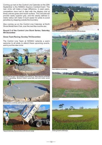 18All go with the pour. The weather was kind for us. Steve Hanson & Gerald Wimmer spreading. Richard Fallas%u2019s quad bike and mini trailer saved much effortDave Wilkins carefully adding the final touches.Topsoil delivery. David Ackery with shovel ready.Chris Renton putting in the hard yards with the RollerDave Wilkins screeding.Finished!!!Grass growth underway!Coming up next on the Control Line Calendar on the 20th September is the NSMAC Equinox Combat Event. The new circle will make a huge difference. In past years, competitors have had to deal with the slippery and at times uneven grass and mulch surface. The concrete will provide vastly superior grip, and the clearly defined 2-metre radius will make it much easier for pilots to avoid penalties by stepping outside the boundary.Also coming up on the Control Line Calendar at North Shore Model Aero Club, over the next few months are:Round 2 of the Control Line Stunt Series; Saturday 6th DecemberGrass Team Racing; Sunday 7th December.The Control Line Team at NSMAC extends a warm welcome to all pilots to attend these upcoming events, and try out the new circle.