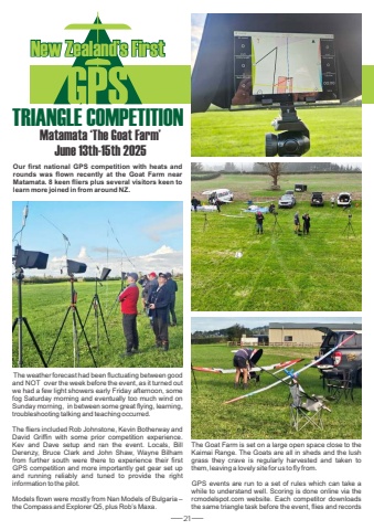 21Our first national GPS competition with heats and rounds was flown recently at the Goat Farm near Matamata. 8 keen fliers plus several visitors keen to learn more joined in from around NZ.TRIANGLE COMPETITIONNew Zealand%u2019s FirstMatamata %u2018The Goat Farm%u2019 June 13th-15th 2025The weather forecast had been fluctuating between good and NOT over the week before the event, as it turned out we had a few light showers early Friday afternoon, some fog Saturday morning and eventually too much wind on Sunday morning, in between some great flying, learning, troubleshooting talking and teaching occurred. The fliers included Rob Johnstone, Kevin Botherway and David Griffin with some prior competition experience. Kev and Dave setup and ran the event. Locals, Bill Derenzy, Bruce Clark and John Shaw, Wayne Bilham from further south were there to experience their first GPS competition and more importantly get gear set up and running reliably and tuned to provide the right information to the pilot.Models flown were mostly from Nan Models of Bulgaria %u2013 the Compass and Explorer Q5, plus Rob%u2019s Maxa.The Goat Farm is set on a large open space close to the Kaimai Range. The Goats are all in sheds and the lush grass they crave is regularly harvested and taken to them, leaving a lovely site for us to fly from.GPS events are run to a set of rules which can take a while to understand well. Scoring is done online via the rcmodelspot.com website. Each competitor downloads the same triangle task before the event, flies and records