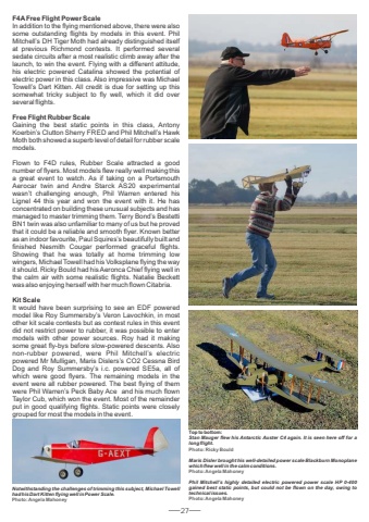 27F4AFree Flight Power ScaleIn addition to the flying mentioned above, there were also some outstanding flights by models in this event. Phil Mitchell%u2019s DH Tiger Moth had already distinguished itself at previous Richmond contests. It performed several sedate circuits after a most realistic climb away after the launch, to win the event. Flying with a different attitude, his electric powered Catalina showed the potential of electric power in this class. Also impressive was Michael Towell%u2019s Dart Kitten. All credit is due for setting up this somewhat tricky subject to fly well, which it did over several flights. Free Flight Rubber ScaleGaining the best static points in this class, Antony Koerbin%u2019s Clutton Sherry FRED and Phil Mitchell%u2019s Hawk Moth both showed a superb level of detail for rubber scale models.Flown to F4D rules, Rubber Scale attracted a good number of flyers. Most models flew really well making this a great event to watch. As if taking on a Portsmouth Aerocar twin and Andre Starck AS20 experimental wasn%u2019t challenging enough, Phil Warren entered his Lignel 44 this year and won the event with it. He has concentrated on building these unusual subjects and has managed to master trimming them. Terry Bond%u2019s Bestetti BN1 twin was also unfamiliar to many of us but he proved that it could be a reliable and smooth flyer. Known better as an indoor favourite, Paul Squires%u2019s beautifully built and finished Nesmith Cougar performed graceful flights. Showing that he was totally at home trimming low wingers, Michael Towell had his Volksplane flying the way it should. Ricky Bould had his Aeronca Chief flying well in the calm air with some realistic flights. Natalie Beckett was also enjoying herself with her much flown Citabria. Kit ScaleIt would have been surprising to see an EDF powered model like Roy Summersby%u2019s Veron Lavochkin, in most other kit scale contests but as contest rules in this event did not restrict power to rubber, it was possible to enter models with other power sources. Roy had it making some great fly-bys before slow-powered descents. Also non-rubber powered, were Phil Mitchell%u2019s electric powered Mr Mulligan, Maris Dislers%u2019s CO2 Cessna Bird Dog and Roy Summersby%u2019s i.c. powered SE5a, all of which were good flyers. The remaining models in the event were all rubber powered. The best flying of them were Phil Warren%u2019s Peck Baby Ace and his much flown Taylor Cub, which won the event. Most of the remainder put in good qualifying flights. Static points were closely grouped for most the models in the event.Top to bottom:Stan Mauger flew his Antarctic Auster C4 again. It is seen here off for a long flight.Photo: Ricky BouldMaris Disler brought his well-detailed power scale Blackburn Monoplane which flew well in the calm conditions.Photo: Angela MahoneyPhil Mitchell%u2019s highly detailed electric powered power scale HP 0-400 gained best static points, but could not be flown on the day, owing to technical issues.Photo: Angela MahoneyNotwithstanding the challenges of trimming this subject, Michael Towell had his Dart Kitten flying well in Power Scale.Photo: Angela Mahoney