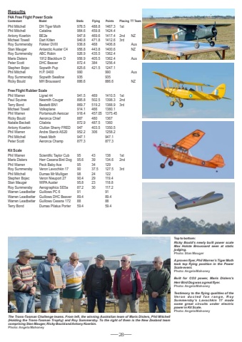 28ResultsF4A Free Flight Power ScalePhil Mitchell DH Tiger Moth 978.5 488.8 1467.3 1st Phil Mitchell Catalina 964.6 459.8 1424.4 Antony Koerbin BE2e 947.8 469.6 1417.4 2nd NZMichael Towell Dart Kitten 940.8 471.8 1412.6 3rd Roy Summersby Fokker DVIII 938.8 468 1406.8 AusStan Mauger Antarctic Auster C4 956.8 443.8 1400.6 NZRoy Summersby ABC Robin 926.9 435.5 1362.4 Maris Dislers 1912 Blackburn D 956.9 405.5 1362.4 AusPeter Scott DHC Beaver 872.4 384 1256.4 Stephen Bojec Sopwith Pup 825.6 421.5 1247.1 Phil Mitchell H.P. 0400 990 990 AusRoy Summersby Sopwith Swallow 935 935 Ricky Bould MH Broussard 886.6 886.6 NZ Free Flight Rubber ScalePhil Warren Lignel 44 941.5 469 1410.5 1st Paul Squires Nesmith Cougar 895.8 502.5 1398.3 2nd Terry Bond Bestetti BN1 869.7 519.2 1388.9 3rd Michael Towell Volksplane 914.1 466 1380.1 Phil Warren Portsmouth Aerocar 918.4 457.05 1375.45 Ricky Bould Aeronca Chief 887 480 1367 Natalie Beckett Citabria 872.9 487.5 1360 Antony Koerbin Clutton Sherry FRED 947 403.5 1350.5 Phil Warren Andre Starck AS20 952.2 306 1258.2 Phil Mitchell Hawk Moth 947.1 947.1 Peter Scott Aeronca Champ 877.3 877.3 Kit ScalePhil Warren Scientific Taylor Cub 95 43 138 1st Maris Dislers Herr Cessna Bird Dog 95.6 39 134.6 2nd Phil Warren Peck Baby Ace 95 34 129 Roy Summersby Veron Lavochkin 17 90 37.5 127.5 3rd Phil Mitchell Dumas Mr Mulligan 98 24 122 Stephen Bojec Veron Nieuport 27 90.4 29 119.4 Stan Mauger WIPA Auster 95.8 23 118.8 Roy Summersby Aerographics SE5a 87.2 30 117.2 Warren Leadbetter Guillows PC 6 91 91 Warren Leadbetter Guillows DHC Beaver 89.4 89.4 Warren Leadbetter Guillows Cessna 172 88 88 Terry Bond Dumas Pilatus Porter 59.4 59.4The Trans-Tasman Challenge teams. From left, the winning Australian team of Maris Dislers, Phil Mitchell (Holding the Trans-Tasman Trophy) and Roy Summersby. To the right of them is the New Zealand team comprising Stan Mauger, Ricky Bould and Antony Koerbin.Photo: Angela MahoneyContestant Model Static Flying Points Placing TT TeamTop to bottom:Ricky Bould%u2019s newly built power scale Max Holste Broussard seen at static judging. Photo: Stan MaugerA proven flyer, Phil Warren%u2019s Tiger Moth took top flying position in the Power Scale event.Photo: Angela MahoneyBuilt for CO2 power, Maris Dislers%u2019s Herr Bird Dog was a great flyer.Photo: Angela MahoneyTestimony to the flying qualities of the Ve r o n d u c t e d f a n r a n g e , R o y Summersby%u2019s Lavochkin 17 made some great circuits under electric power in Kit Scale.Photo: Angela Mahoney