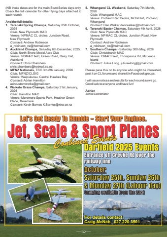 (NB these dates are for the main Stunt Series days only. Check the full calendar for other flying days attached to each round)And the full details:1. Taranaki Spring Champs, Saturday 25th October, 2025Club: New Plymouth MACVenue: NPMAC CL circles, Junction Road, New PlymouthContact: Andrew Robinson a_robinson_nz@hotmail.com2. Auckland Champs, Saturday 6th December, 2025Club: North Shore Model Aero ClubVenue: NSMAC field, Green Road, Dairy Flat, AucklandContact: Chris Chambers chris.chambers@hotmail.co.nz 3. MFNZ Nationals, TBC 3rd-8th January, 2026Club: MFNZ/CLSIGVenue: Waipukurau, Central Hawkes BayContact: Adrian Hamilton ashcustomworks@gmail.com4. Waikato Grass Champs, Saturday 31st January, 2026Club: Hamilton MACVenue: Meremere Sports Park, Heather Green Place, MeremereContact: Kevin Barnes K.Barnes@xtra.co.nz5. Whangarei CL Weekend, Saturday 7th March, 2026Club: Whangarei MACVenue: Portland Rec Centre, McGill Rd, Portland, WhangareiContact: Dan Walker danrwalker@hotmail.com6. Taranaki Easter Champs, Saturday 4th April, 2026Club: New Plymouth MACVenue: NPMAC CL circles, Junction Road, New PlymouthContact: Andrew Robinson a_robinson_nz@hotmail.com7. Southern Champs - Saturday 30th May, 2026Club: Christchurch MACVenue: CMAC Field, Thompsons Rd, McLeans IslandContact: Julius Long juliuswlong@gmail.com Please pass this on to anyone who might be interested, post it on CL forums and share it in Facebook groups.I will issue notices and results for each round as we go.Good luck to everyone and have fun!Adrian Series CoordinatorJet, Scale & Sport PlanesFor details contact Craig McNab 027 220 3501Let%u2019s Get Ready To Rumble - Start Your Engines.Entrance off Creyke Rd over the railway lineDarfield 2025 Events OctoberSaturday 25th, Sunday 26th & Monday 27th (Labour day)Camping available from the 23rd32