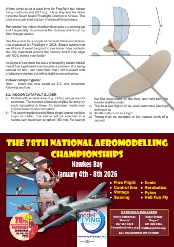 the flier must stand on the floor, and hold both the handle and the model.c) The best two flights of six shall determine placings and records d) All attempts count as a flight e) Timing shall be recorded to the nearest tenth of a secondWinter tends to be a quiet time for Freeflight but Indoor flying continues and Bill Long, Julius, Kay and the Team have the South Island Freeflight Champs in Kirwee. The days are a cold start but turn into beautiful calm days.Remember the Indoor Morrinsville events are coming up and I especially recommend the October event run by Stan Mauger and co.See the poster for a couple of contests that David Ackery has organised for Freeflight in 2026. Simple events that we all love. It would be good to see some more contests like this organised around the country and if they align with NDC events even better!As some of you know the issue of obtaining certain Model diesel fuel ingredients has become a problem. It is being worked on and I am optomistic that I will succeed with producing more fuel but with a slight increase in price.Indoor catapult glider Note %u2013 insert this new event as 5.2, and renumber following sections.5.2. INDOOR CATAPULT GLIDERa) Models with variable area (e.g. folding wings) are not permitted. The number of models eligible for entry by each competitor is three. An individual model may only be flown by one competitor.b) The launching device shall be a single loop or multiple loops of rubber. The rubber will be attached to a handle with maximum length of 150 mm. For launch The 78th National Aeromodelling ChampionshipsHawkes Bay January 4th - 8th 2026Free FlightControl line Vintage SoaringScaleAerobaticsPylonHeli Fun Fly78th Model Flying New ZealandNATIONALSHawkes BayJan. 4th - 8th2026NATIONALS MANAGERSFrazer Briggs %u201cBogan%u201d 021 288 9455CNIRep@mfnz.org ALL ENQUIRIES WELCOMEKevin Botherway %u201cRowdy%u201d 027 557 0470CompMan@mfnz.org 35