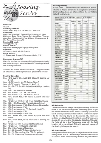 36President: VacantSecretary/TreasurerDavid James (PN) %u2013 06 354 3452, 027 339 0007Committee:Aneil Patel (Auckland), Dave Griffin (Christchurch), Kevin Botherway & Joe Wurts (Hawkes Bay), John Shaw (Timaru), Allan Knox (Christchurch), Peter Williams (Paraparaumu) & Rex Ashwell (Marlborough)Soaring SIG email:soaring@mfnz.orgNews & info at:http://www.modelflyingnz.org/sigs/soaring.htmlFacebook:NZ Soaring SIG & NZ R/C Soaring.Postal address:41 Chippendale Crescent, Palmerston North. 4412From your Soaring SIGCheck out: and make sure you have the latest NZ Soaring rulebook and Soaring calendar. Also see the events listed on the MFNZ Google calendar at: https://www.mfnz.org/members-pilots/mfnz-events/Soaring Calendar.Sep. NDC Event 430, ALES 200 Class M Scoring per 3.13.7Sep. NDC Event 431, ALES Radian Class PSep. NDC Event 432, Thermal J (2,4,6,8,10)Sep. 6th - 7th F3B Rd 4 NI Series-Black Bridge, Hawkes BaySep. 12th - 14th Aerotow PukekawaOct. NDC Event 433, ALES 123 Class NOct. NDC Event 434, ALES Radian Class POct. NDC Event 435, F3K Tasks B,D,G,H total raw scoresOct. NDC Event 436, FAI F5J, 4 Rds Total Raw ScoresOct. 10th - 12th, NIAerotow Venue to be confirmedOct. 16th Soarchamps - F3B - Black Bridge, Hawkes BayOct. 17th Soarchamps - F3JOct. 17th Soarchamps - ALES Radian & 2M eRESOct. 18th Soarchamps - F5JOct. 19th Soarchamps - F3K & F5KNov. NDC Event 437, F3K Tasks B,D,G,H total raw scoresNov. NDC Event #438, ALES 200 Class M Scoring per 3.13.7Nov. NDC Event 439, Thermal H (2 Metre Glider)Nov. NDC Event 440, Class R, eRES 2MNov. 21st - 23rd, Aerotow Matamata.Dec. 3rd - 4th, Open GPS Camp, Christchurch.Dec. 5th - 7th, Electric Open FAI F5J, Christchurch.Dec. 5th - 7th, NIAerotow Venue to be confirmedhttps://www.mfnz.org/members-pilots/special-interest-groups/soaring/NZ Nationals:The next National Champs has a great Soaring Schedule which is full on and arranged for all soaring pilots to get the most out of the full week. With F3J first up (one of the winch events) is scheduled so we have sufficient help for F3B the following day to run the course. F5J has been split into two days to cover if we have a weather issue, we should still get a result in this popular discipline. This year the Nats will be in the Waipukurau area with the field location still to be advised. This will, as usual, be one of the Soaring SIG%u2019s premier events.NZ Soarchamps.Mark your calendar now, put in for your leave and come and fly at the 2025 NZ Soarchamps from the 16th to 19th of October. To be flown in sunny Hawkes Bay at the Black Soaring History:It was 1992 %u2013 Lower North Island Thermal Tri-Series. Thanks to Wayne Bilham for sharing this bit of history. Unfortunately, there are a few pilots on the list that are not with us anymore.