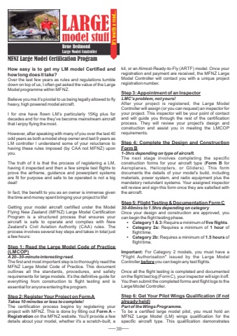 38LARGE model stuffRene RedmondLarge Model ControllerMFNZ Large Model Certification ProgramHow easy is to get my LM model Certified and how long does it take?Over the last few years as rules and regulations tumble down on top of us, I often get asked the value of the Large Model programme within MFNZ. Believe you me it%u2019s pivotal to us being legally allowed to fly heavy, high powered model aircraft.I for one have flown LM%u2019s particularly 15Kg plus for decades and for me they%u2019ve become mainstream aircraft that I enjoy flying the most.However, after speaking with many of you over the last 40 odd years as both a model shop owner and last 9 years as LM controller I understand some of your reluctance to having these rules imposed (by CAA not MFNZ) upon you.The truth of it is that the process of registering a LM, having it inspected and then a few simple test flights to prove the airframe, guidance and powerplant systems are fit for purpose and safe to be operated is not a big deal! In fact, the benefit to you as an owner is immense given the time and money spent bringing your project to life!Getting your model aircraft certified under the Model Flying New Zealand (MFNZ) Large Model Certification Program is a structured process that ensures your aircraft is safe to operate and complies with New Zealand's Civil Aviation Authority (CAA) rules. The process involves several key steps and takes in total just a few hours:Step 1: Read the Large Model Code of Practice (LMCOP)A20%u201330-minute interesting read.The first and most important step is to thoroughly read the MFNZ Large Model Code of Practice. This document outlines all the standards, procedures, and safety requirements for large models. It's the definitive guide for everything from construction to flight testing and is essential for anyone entering the program.Step 2: Register Your Project on Form ATakes 10 minutes or less to complete!The certification process begins by registering your project with MFNZ. This is done by filling out Form A %u2013 Registration on the MFNZ website. You'll provide a few details about your model, whether it's a scratch-built, a kit, or an Almost-Ready-to-Fly (ARTF) model. Once your registration and payment are received, the MFNZ Large Model Controller will contact you with a unique project registration number.Step 3: Appointment of an InspectorLMC%u2019s problem, not yours!After your project is registered, the Large Model Controller will assign (or you can request) an inspector for your project. This inspector will be your point of contact and will guide you through the rest of the certification process. They will review your project's design and construction and assist you in meeting the LMCOP requirements.Step 4: Complete the Design and Construction Form B1-3hrs depending on type of aircraft.The next stage involves completing the specific construction forms for your aircraft type (Form B for Aeroplanes, Helicopters, or Gliders). This form documents the details of your model's build, including materials, power system, and radio equipment plus the mandatory redundant systems. Your assigned inspector will review and sign this form once they are satisfied with the aircraft.Step 5: Flight Testing & Documentation Form C30-40mins to 1.5hrs depending on categoryOnce your design and construction are approved, you can begin the flight testing phase.%u2022 Category 1 & 3: Require a minimum of five flights.%u2022 Category 2a: Requires a minimum of 1 hour of flight time.%u2022 Category 2b: Requires a minimum of 1.5 hours of flight time.Important: For Category 2 models, you must have a \Controller before you can begin any test flights. Once all the flight testing is completed and documented on the flight test log (Form C), your inspector will sign it off. You then submit the completed forms and flight logs to the Large Model Controller.Step 6: Get Your Pilot Wings Qualification (if not already held)Part of the Wings Programme.To be a certified large model pilot, you must hold an MFNZ Large Model (LM) wings qualification for the specific aircraft type. This qualification demonstrates