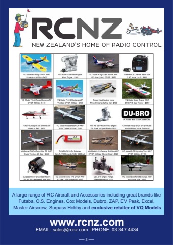www.rcnz.comEMAIL: sales@rcnz.com PHONE: 03-347-4434A large range of RC Aircraft and Accessories including great brands likeFutaba, O.S. Engines, Cox Models, Dubro, ZAP, EV Peak, Excel, Master Airscrew, Surpass Hobby and exclusive retailer of VQ Models3