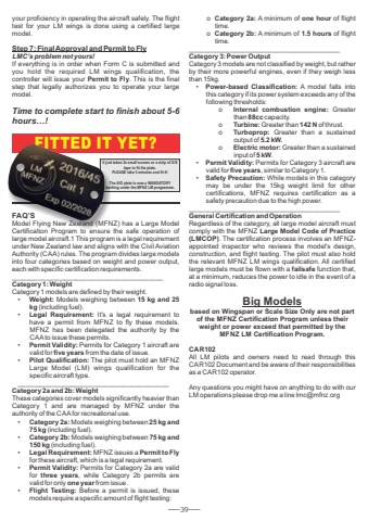 FITTED IT YET?36your proficiency in operating the aircraft safely. The flight test for your LM wings is done using a certified large model.Step 7: Final Approval and Permit to FlyLMC%u2019s problem not yours!If everything is in order when Form C is submitted and you hold the required LM wings qualification, the controller will issue your Permit to Fly. This is the final step that legally authorizes you to operate your large model.Time to complete start to finish about 5-6 hours%u2026!It just takes 2x small screws or a strip of D/S tape to fit the plate. PLEASE take 5 minutes and fit it!The AID plate is now a MANDATORYmarking under the MFNZ LM programme.FAQ%u2019SModel Flying New Zealand (MFNZ) has a Large Model Certification Program to ensure the safe operation of large model aircraft.1 This program is a legal requirement under New Zealand law and aligns with the Civil Aviation Authority (CAA) rules. The program divides large models into four categories based on weight and power output, each with specific certification requirements.________________________________________Category 1: WeightCategory 1 models are defined by their weight.%u2022 Weight: Models weighing between 15 kg and 25 kg (including fuel).%u2022 Legal Requirement: It's a legal requirement to have a permit from MFNZ to fly these models. MFNZ has been delegated the authority by the CAAto issue these permits.%u2022 Permit Validity: Permits for Category 1 aircraft are valid for five years from the date of issue.%u2022 Pilot Qualification: The pilot must hold an MFNZLarge Model (LM) wings qualification for the specific aircraft type.________________________________________Category 2a and 2b: WeightThese categories cover models significantly heavier than Category 1 and are managed by MFNZ under the authority of the CAAfor recreational use.%u2022 Category 2a: Models weighing between 25 kg and 75 kg (including fuel).%u2022 Category 2b: Models weighing between 75 kg and 150 kg (including fuel).%u2022 Legal Requirement: MFNZ issues a Permit to Flyfor these aircraft, which is a legal requirement.%u2022 Permit Validity: Permits for Category 2a are valid for three years, while Category 2b permits are valid for only one yearfrom issue.%u2022 Flight Testing: Before a permit is issued, these models require a specific amount of flight testing:o Category 2a: A minimum of one hour of flight time.o Category 2b: A minimum of 1.5 hours of flight time.________________________________________Category 3: Power OutputCategory 3 models are not classified by weight, but rather by their more powerful engines, even if they weigh less than 15kg.%u2022 Power-based Classification: A model falls into this category if its power system exceeds any of the following thresholds:o Internal combustion engine: Greater than 88cc capacity.o Turbine: Greater than 142 N of thrust.o Turboprop: Greater than a sustained output of 5.2 kW.o Electric motor: Greater than a sustained input of 5 kW.%u2022 Permit Validity: Permits for Category 3 aircraft are valid for five years, similar to Category 1.%u2022 Safety Precaution: While models in this category may be under the 15kg weight limit for other certifications, MFNZ requires certification as a safety precaution due to the high power.________________________________________General Certification and OperationRegardless of the category, all large model aircraft must comply with the MFNZ Large Model Code of Practice (LMCOP). The certification process involves an MFNZappointed inspector who reviews the model's design, construction, and flight testing. The pilot must also hold the relevant MFNZ LM wings qualification. All certified large models must be flown with a failsafe function that, at a minimum, reduces the power to idle in the event of a radio signal loss.Big Modelsbased on Wingspan or Scale Size Only are not part of the MFNZ Certification Program unless their weight or power exceed that permitted by the MFNZ LM Certification Program.CAR102All LM pilots and owners need to read through this CAR102 Document and be aware of their responsibilities as a CAR102 operator.Any questions you might have on anything to do with our LM operations please drop me a line lmc@mfnz.org39