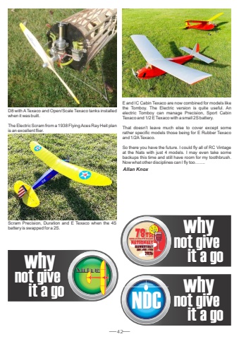 42D8 with ATexaco and Open/Scale Texaco tanks installed when it was built.The Electric Scram from a 1938 Flying Aces Ray Heit plan is an excellent flier.Scram Precision, Duration and E Texaco when the 4S battery is swapped for a 2S.E and IC Cabin Texaco are now combined for models like the Tomboy. The Electric version is quite useful. An electric Tomboy can manage Precision, Sport Cabin Texaco and 1/2 E Texaco with a small 2S battery.That doesn%u2019t leave much else to cover except some rather specific models those being for E Rubber Texaco and 1/2ATexaco.So there you have the future. I could fly all of RC Vintage at the Nats with just 4 models. I may even take some backups this time and still have room for my toothbrush. Now what other disciplines can I fly too%u2026%u2026.Allan Knoxwhynot give it a go NDCwhynot give it a go 78th Model Flying New ZealandNATIONALSHawkes BayJan. 4th - 8th2026whywhynot give not give it a go it a go whywhynot give not give it a go it a go Vintage