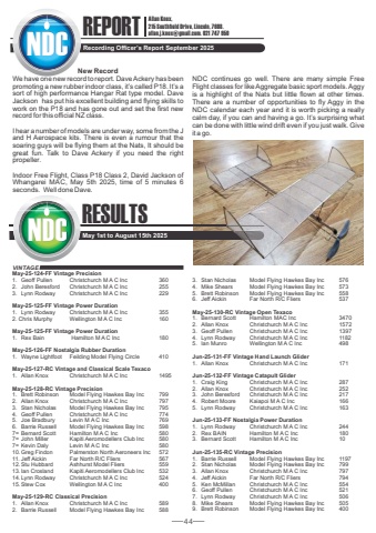 44REPORTMarch 2024Allan Knox, 215 Southfield Drive, Lincoln, 7608. allan.j.knox@gmail.com. 021 747 950RESULTS NDC May 1st to August 15th 2025NDC Recording Officer%u2019s Report September 2025VINTAGEMay-25-124-FF Vintage Precision1. Geoff Pullen Christchurch M A C Inc 3602. John Beresford Christchurch M A C Inc 2553. Lynn Rodway Christchurch M A C Inc 229May-25-125-FF Vintage Power Duration1. Lynn Rodway Christchurch M A C Inc 3552. Chris Murphy Wellington M A C Inc 160May-25-125-FF Vintage Power Duration1. Rex Bain Hamilton M A C Inc 180May-25-126-FF Nostalgia Rubber Duration1. Wayne Lightfoot Feilding Model Flying Circle 410May-25-127-RC Vintage and Classical Scale Texaco1. Allan Knox Christchurch M A C Inc 1495May-25-128-RC Vintage Precision1. Brett Robinson Model Flying Hawkes Bay Inc 7992. Allan Knox Christchurch M A C Inc 7973. Stan Nicholas Model Flying Hawkes Bay Inc 7954. Geoff Pullen Christchurch M A C Inc 7745. Joe Bradbury Levin M A C Inc 7696. Barrie Russell Model Flying Hawkes Bay Inc 5987= Bernard Scott Hamilton M A C Inc 5807= John Miller Kapiti Aeromodellers Club Inc 5807= Kevin Daly Levin M A C Inc 58010. Greg Findon Palmerston North Aeroneers Inc 57211. Jeff Aickin Far North R/C Fliers 56712. Stu Hubbard Ashhurst Model Fliers 55913. Ian Crosland Kapiti Aeromodellers Club Inc 53214. Lynn Rodway Christchurch M A C Inc 52415. Stew Cox Wellington M A C Inc 400May-25-129-RC Classical Precision 1. Allan Knox Christchurch M A C Inc 5892. Barrie Russell Model Flying Hawkes Bay Inc 5883. Stan Nicholas Model Flying Hawkes Bay Inc 5764. Mike Shears Model Flying Hawkes Bay Inc 5735. Brett Robinson Model Flying Hawkes Bay Inc 5586. Jeff Aickin Far North R/C Fliers 537May-25-130-RC Vintage Open Texaco1. Bernard Scott Hamilton MAC Inc 34702. Allan Knox Christchurch M A C Inc 15723. Geoff Pullen Christchurch M A C Inc 13974. Lynn Rodway Christchurch M A C Inc 11825. Ian Munro Wellington M A C Inc 498Jun-25-131-FF Vintage Hand Launch Glider1. Allan Knox Christchurch M A C Inc 171Jun-25-132-FF Vintage Catapult Glider1. Craig King Christchurch M A C Inc 2872. Allan Knox Christchurch M A C Inc 2523. John Beresford Christchurch M A C Inc 2174. Robert Moore Kaiapoi M A C Inc 1665. Lynn Rodway Christchurch M A C Inc 163Jun-25-133-FF Nostalgia Power Duration1. Lynn Rodway Christchurch M A C Inc 2442. Rex BAIN Hamilton M A C Inc 1803. Bernard Scott Hamilton M A C Inc 10Jun-25-135-RC Vintage Precision1. Barrie Russell Model Flying Hawkes Bay Inc 11972. Stan Nicholas Model Flying Hawkes Bay Inc 7993. Allan Knox Christchurch M A C Inc 7974. Jeff Aickin Far North R/C Fliers 7945. Ken McMillan Christchurch M A C Inc 5546. Geoff Pullen Christchurch M A C Inc 5217. Lynn Rodway Christchurch M A C Inc 5068. Mike Shears Model Flying Hawkes Bay Inc 5059. Brett Robinson Model Flying Hawkes Bay Inc 400New RecordWe have one new record to report. Dave Ackery has been promoting a new rubber indoor class, it%u2019s called P18. It%u2019s a sort of high performance Hangar Rat type model. Dave Jackson has put his excellent building and flying skills to work on the P18 and has gone out and set the first new record for this official NZ class. I hear a number of models are under way, some from the J and H Aerospace kits. There is even a rumour that the soaring guys will be flying them at the Nats, It should be great fun. Talk to Dave Ackery if you need the right propeller.Indoor Free Flight, Class P18 Class 2, David Jackson of Whangarei MAC, May 5th 2025, time of 5 minutes 6 seconds. Well done Dave.NDC continues go well. There are many simple Free Flight classes for like Aggregate basic sport models. Aggy is a highlight of the Nats but little flown at other times. There are a number of opportunities to fly Aggy in the NDC calendar each year and it is worth picking a really calm day, if you can and having a go. It%u2019s surprising what can be done with little wind drift even if you just walk. Give it a go.