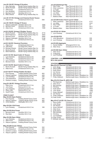 45Jun-25-136-RC Vintage E Duration1. Stan Nicholas Model Flying Hawkes Bay Inc 13772. Barrie Russell Model Flying Hawkes Bay Inc 9403. Allan Knox Christchurch M A C Inc 9204. Ken McMillan Christchurch M A C Inc 9005. Bernard Scott Hamilton M A C Inc 4476. Mike Shears Model Flying Hawkes Bay Inc 352Jun-25-137-RC Vintage and Classical Scale Texaco1. Allan Knox Christchurch M A C Inc 938Jun-25-138-RC Vintage E Texaco1. Wayne Cartwright Hamilton M A C Inc 19442. Bernard Scott Hamilton M A C Inc 18973. Allan Knox Christchurch M A C Inc 1568Jul-25-139-RC Vintage E Rubber Texaco1. Barrie Russell Model Flying Hawkes Bay Inc 47152. Brett Robinson Model Flying Hawkes Bay Inc 35533. Bernard Scott Hamilton M A C Inc 26644. Wayne Cartwright Hamilton M A C Inc 21495. Allan Knox Christchurch M A C Inc 1183 Jul-25-140-RC Classical Precision1. Allan Knox Christchurch M A C Inc 5942= Jeff Aickin Far North R/C Fliers 5932= Michael Shears Model Flying Hawkes Bay Inc 5934. Barrie Russell Model Flying Hawkes Bay Inc 5915. Brett Robinson Model Flying Hawkes Bay Inc 574 Jul-25-141-RC Sport Cabin IC Texaco1. Lynn Rodway Christchurch M A C Inc 10582. Allan Knox Christchurch M A C Inc 9093. Lynn Rodway Christchurch M A C Inc 7994. Bernard Scott Hamilton M A C Inc 406 Jul-25-142-RC Sport Cabin E Texaco1. Barrie Russell Model Flying Hawkes Bay Inc 15982. Allan Knox Christchurch M A C Inc 866 Jul-25-164-FF Vintage Rubber Duration 1. Paul Squires Feilding Model Flying Circle 4642. Wayne Lightfoot Feilding Model Flying Circle 4393. Lynn Rodway Christchurch M A C Inc 2354. John Beresford Christchurch M A C Inc 1955. Graham Lovejoy Feilding Model Flying Circle 70 Aug-25-146-RC Vintage Precision 1. Allan Knox Christchurch M A C Inc 7982. John Ryan Rotorua M A C Inc 6003. Lynn Rodway Christchurch M A C Inc 5404. Dave Little Rotorua M A C Inc 5215. Geoff Pullen Christchurch M A C Inc 512FREE FLIGHTMay-25-233-Open Rubber 1. Paul Squires Feilding Model Flying Circle 5402. Wayne Lightfoot Feilding Model Flying Circle 4653. Chris Murphy Wellington M A C Inc 435May-25-234-1/2A Power1. Lynn Rodway Christchurch M A C Inc 168May-25-235-Kiwi Power1. Bernard Scott Hamilton M A C Inc 2022. Rex Bain Hamilton M A C Inc 120May-25-236-Open Glider1. Lynn Rodway Christchurch M A C Inc 3262. Allan Knox Christchurch M A C Inc 2633. Wayne Lightfoot Feilding Model Flying Circle 74May-25-238-Coupe d'Hiver 1. Paul Squires Feilding Model Flying Circle 3422. John Beresford Christchurch M A C Inc 2593. Graham Lovejoy Feilding Model Flying Circle 2254. Wayne Lightfoot Feilding Model Flying Circle 211Jun-25-239-Hangar Rat1. Alec Fuller New Plymouth M A C Inc 3252. Allen Lawrence New Plymouth M A C Inc 3013. Jo Fuller New Plymouth M A C Inc 2954. Alan Reed New Plymouth M A C Inc 2715. Jon Allen New Plymouth M A C Inc 2176. Chris Allen New Plymouth M A C Inc 2357. Makena Allen New Plymouth M A C Inc 184Jun-25-240-Indoor Hand Launch Glider1. Allen Lawrence New Plymouth M A C Inc 41.82. Jon Allen New Plymouth M A C Inc 33.83. Alec Fuller New Plymouth M A C Inc 314. Jo Fuller New Plymouth M A C Inc 29.35. Makena Allen New Plymouth M A C Inc 26.3Jun-25-241-A1 Glider1. Lynn Rodway Christchurch M A C Inc 114Jun-25-242-P301. John Beresford Christchurch M A C Inc 3362. Lynn Rodway Christchurch M A C Inc 268Jul-25-245-Aggregate1. Daniel Walker Whangarei M A C Inc 6102. Allan Knox Christchurch M A C Inc 383 Jul-25-246-Open Glider1. Allan Knox Christchurch M A C Inc 5312. Craig King Christchurch M A C Inc 4983. Lynn Rodway Christchurch M A C Inc 194CONTROL LINENil in this periodSOARINGMay-25-415-Thermal D (F500)1. John Shaw Christchurch M A C Inc 14932. Dave Griffin Christchurch M A C Inc 14893. Keith Elliott Christchurch M A C Inc 14854. Ian Harvey Christchurch M A C Inc 14785. Allan Knox Christchurch M A C Inc 14096. Rex Ashwell Marlborough Assoc. Modellers Inc 12607. Philip Gibbison Marlborough Assoc. Modellers Inc 1030May-25-416-Class R, eRES 2M1. Phil Sparrow Marlborough Assoc. Modellers Inc 13052. Allan Knox Christchurch M A C Inc 12863. Rex Ashwell Marlborough Assoc. Modellers Inc 12334. Phil Elvy Marlborough Assoc. Modellers Inc 12315. Keith Elliott Christchurch M A C Inc 10696. John Shaw Christchurch M A C Inc 10687. Anton Nikoloff Christchurch M A C Inc 10178. Ian Harvey Christchurch M A C Inc 9249. Philip Gibbison Marlborough Assoc. Modellers Inc 85210. Peter Smith Marlborough Assoc. Modellers Inc 647May-25-417-ALES 123 Class N1. Dave Griffin Christchurch M A C Inc 12292. John Shaw Christchurch M A C Inc 12263. Ian Harvey Christchurch M A C Inc 12234. Anton Nikoloff Christchurch M A C Inc 11985. Allan Knox Christchurch M A C Inc 11076. Keith Elliott Christchurch M A C Inc 10607. Rex Ashwell Marlborough Assoc. Modellers Inc 10578. Phil Elvy Marlborough Assoc. Modellers Inc 10559. Carl McMillan Marlborough Assoc. Modellers Inc 101610. Peter Smith Marlborough Assoc. Modellers Inc 95411. Michael Johnson Christchurch M A C Inc 847