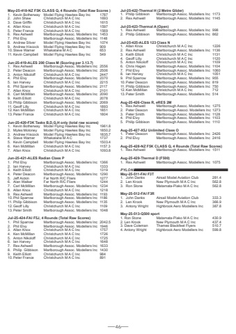 46May-25-418-NZ F5K CLASS Q, 4 Rounds (Total Raw Scores )1. Kevin Botherway Model Flying Hawkes Bay Inc 17872. John Shaw Christchurch M A C Inc 16933. Dave Griffin Christchurch M A C Inc 16154. Allan Knox Christchurch M A C Inc 15975. Peter France Christchurch M A C Inc 15696. Rex Ashwell Marlborough Assoc. Modellers Inc 14537. Phil Elvy Marlborough Assoc. Modellers Inc 11488. Andrew Stiver Model Flying Hawkes Bay Inc 10749. Andrew Hiscock Model Flying Hawkes Bay Inc 90910. Steve Warner Whakatane M A C 65311. Kevin Campbell Model Flying Hawkes Bay Inc 549Jun-25-419-ALES 200 Class M (Scoring per 3.13.7)1. Rex Ashwell Marlborough Assoc. Modellers Inc 25562. Peter Deacon Marlborough Assoc. Modellers Inc 25063. Anton Nikoloff Christchurch M A C Inc 24474. Phil Elvy Marlborough Assoc. Modellers Inc 23705. Ian Harvey Christchurch M A C Inc 22156. Phil Sparrow Marlborough Assoc. Modellers Inc 21177. Allan Knox Christchurch M A C Inc 21018. Carl McMillan Marlborough Assoc. Modellers Inc 20909. Keith Elliott Christchurch M A C Inc 207810. Philip Gibbison Marlborough Assoc. Modellers Inc 206911. Geoff Lilly Christchurch M A C Inc 189312. Ken McMillan Christchurch M A C Inc 185113. Peter France Christchurch M A C Inc 1804Jun-25-420-F3K Tasks B,D,G,H only (total raw scores)1. Kevin Botherway Model Flying Hawkes Bay Inc 1961.82. Myles Moloney Model Flying Hawkes Bay Inc 1850.23. Andrew Hiscock Model Flying Hawkes Bay Inc 1835.74. Steve Warner Whakatane M A C 17375. Kevin Campbell Model Flying Hawkes Bay Inc 1503.46. Ken McMillan Christchurch M A C Inc 1157.37. Allan Knox Christchurch M A C Inc 1093.8Jun-25-421-ALES Radian Class P1. Phil Elvy Marlborough Assoc. Modellers Inc 13662. Ian Harvey Christchurch M A C Inc 13333. Keith Elliott Christchurch M A C Inc 13194. Peter Deacon Marlborough Assoc. Modellers Inc 12905. Jeff Aickin Far North R/C Fliers 12776. Alan Walker Far North R/C Fliers 12447. Carl McMillan Marlborough Assoc. Modellers Inc 12348. Allan Knox Christchurch M A C Inc 12189. Rex Ashwell Marlborough Assoc. Modellers Inc 119310. Phil Sparrow Marlborough Assoc. Modellers Inc 118611. Philip Gibbison Marlborough Assoc. Modellers Inc 113512. Geoff Lilly Christchurch M A C Inc 110913. Peter Smith Marlborough Assoc. Modellers Inc 1048Jul-25-424-FAI F5J, 4 Rounds (Total Raw Scores)1. Phil Sparrow Marlborough Assoc. Modellers Inc 2042.52. Phil Elvy Marlborough Assoc. Modellers Inc 19463. Allan Knox Christchurch M A C Inc 17574. Ken McMillan Christchurch M A C Inc 17265. Anton Nikoloff Christchurch M A C Inc 17256. Ian Harvey Christchurch M A C Inc 16487. Rex Ashwell Marlborough Assoc. Modellers Inc 16338. Philip Gibbison Marlborough Assoc. Modellers Inc 14309. Keith Elliott Christchurch M A C Inc 98410. Peter France Christchurch M A C Inc 891 Jul-25-422-Thermal H (2 Metre Glider) 1. Philip Gibbison Marlborough Assoc. Modellers Inc 11732. Rex Ashwell Marlborough Assoc. Modellers Inc 1145 Jul-25-423-Thermal A (Open) 1. Rex Ashwell Marlborough Assoc. Modellers Inc 9982. Philip Gibbison Marlborough Assoc. Modellers Inc 862 Jul-25-425-ALES 123 Class N 1. Allan Knox Christchurch M A C Inc 12262. Rex Ashwell Marlborough Assoc. Modellers Inc 11363. Keith Elliott Christchurch M A C Inc 11314. Geoff Lilly Christchurch M A C Inc 11205. Anton Nikoloff Christchurch M A C Inc 11096. Chris Hagen Marlborough Assoc. Modellers Inc 11047. Phil Elvy Marlborough Assoc. Modellers Inc 10608. Ian Harvey Christchurch M A C Inc 10519. Phil Sparrow Marlborough Assoc. Modellers Inc 95510. Peter Deacon Marlborough Assoc. Modellers Inc 81911. Philip Gibbison Marlborough Assoc. Modellers Inc 75012. Ken McMillan Christchurch M A C Inc 71213. Peter Smith Marlborough Assoc. Modellers Inc 514 Aug-25-426-Class R, eRES 2M 1. Rex Ashwell Marlborough Assoc. Modellers Inc 12752. Peter Deacon Marlborough Associ. Modellers Inc 12733. Peter Smith Marlborough Assoc. Modellers Inc 11284. Phil Elvy Marlborough Assoc. Modellers Inc 11035. Philip Gibbison Marlborough Assoc. Modellers Inc 1110 Aug-25-427-X5J Unlimited Class O 1. Peter Deacon Marlborough Assoc. Modellers Inc 24262. Phil Elvy Marlborough Assoc. Modellers Inc 2416 Aug-25-428-NZ F5K CLASS Q, 4 Rounds (Total Raw Scores) 1. Rex Ashwell Marlborough Assoc. Modellers Inc 1511 Aug-25-429-Thermal D (F500) 1. Rex Ashwell Marlborough Assoc. Modellers Inc 1075 PYLON May-25-511-FAI F3T 1. John Danks Airsail Model Aviation Club 281.42. Len Krook New Plymouth M A C Inc 562.83. Ron Stone Matamata-Piako M A C Inc 562.8May-25-512-FAI F3R1. John Danks Airsail Model Aviation Club 333.32. Len Krook New Plymouth M A C Inc 366.93. Antony Wright Highbrook Aero Modellers Inc 387.8May-25-513-Q500 sport1. Ron Stone Matamata-Piako M A C Inc 430.92. Len Krook New Plymouth M A C Inc 437.43. Dave Coleman Thames Blackfeet Flyers 510.74. Antony Wright Highbrook Aero Modellers Inc 599.8