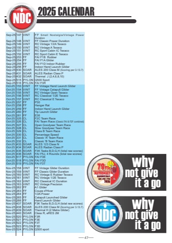 47Sep-25 147 VINT FF Small Nostalgia/Vintage Power DurationSep-25 148 VINT FF Classic Power DurationSep-25 149 VINT RC Vintage 1/2A TexacoSep-25 150 VINT RC Vintage A TexacoSep-25 151 VINT RC Sport Cabin IC TexacoSep-25 152 VINT RC Sport Cabin E TexacoSep-25 253 FF FAI F1B RubberSep-25 254 FF FAI F1A GliderSep-25 255 FF FAI F1D Indoor RubberSep-25 256 FF Indoor Hand Launch GliderSep-25 430 SOAR ALES 200 Class M (Scoring per 3.13.7)Sep-25 431 SOAR ALES Radian Class PSep-25 432 SOAR Thermal J (2,4,6,8,10)Sep-25 515 PYLON Q500 SportSep-25 516 PYLON FAI F3ROct-25 153 VINT FF Vintage Hand Launch GliderOct-25 154 VINT FF Vintage Catapult GliderOct-25 155 VINT RC Vintage Open TexacoOct-25 156 VINT RC Classical 1/2E TexacoOct-25 157 VINT RC Classical E TexacoOct-25 257 FF P30Oct-25 258 FF Hangar RatOct-25 259 FF Indoor Hand Launch GliderOct-25 260 FF Tip Launch GliderOct-25 261 FF E36Oct-25 325 CL F2C Team RaceOct-25 326 CL FAI Team Race (Classic FAI & F2F combined)Oct-25 327 CL Open Goodyear Team Race Oct-25 328 CL Slow Goodyear Team RaceOct-25 329 CL Class B Team RaceOct-25 330 CL Percentage Speed Oct-25 331 CL Classic 'A' Team RaceOct-25 332 CL Classic 'B Team RaceOct-25 433 SOAR ALES 123 Class NOct-25 434 SOAR ALES Radian Class POct-25 435 SOAR F3K Tasks B,D,G,H (total raw scores)Oct-25 436 SOAR FAI F5J, 4 Rounds (total raw scores)Oct-25 517 PYLON FAI F3EOct-25 518 PYLON FAI F3DOct-25 519 PYLON FAI F3TNov-25 158 VINT FF Vintage Glider DurationNov-25 159 VINT FF Classic Glider DurationNov-25 160 VINT RC Vintage E Rubber TexacoNov-25 161 VINT RC Vintage 1/2E TexacoNov-25 162 VINT RC Classical IC DurationNov-25 163 VINT RC Vintage PrecisionNov-25 262 FF A1 GliderNov-25 263 FF Coupe d'HiverNov-25 264 FF 1/2A PowerNov-25 265 FF Catapult Launched GliderNov-25 266 FF Hand Launch GliderNov-25 437 SOAR F3K Tasks B,D,G,H (total raw scores)Nov-25 438 SOAR ALES 200 Class M (Scoring per 3.13.7)Nov-25 439 SOAR Thermal H (2 Metre Glider)Nov-25 440 SOAR Class R, eRES 2MNov-25 520 PYLON F3RNov-25 521 PYLON F3ENov-25 522 PYLON F3TNov-25 523 PYLON F3DNov-25 524 PYLON Q500 sportwhynot give it a go NDCwhynot give it a go 2025 CALENDAR NDC78th Model Flying New ZealandNATIONALSHawkes BayJan. 4th - 8th2026whynot give it a go