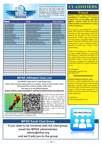 48MFNZ Affiliated Club ListMFNZ Email Chat GroupOr simply use your smart phone camera on this QR code to access the map. ( note that if you%u2019ve got an older phone you may need to download a QRcode reader to make this work) Using the Maps application on the phone, it will even give you directions to get to the clubs MAPS flying site!If you wish to be involved with the chat group, email the MFNZ administrator admin@mfnz.org and we%u2019ll add you to the groupThe MFNZ Clubs list is a web based map. Each club's primary flying site has a marker. Click on this marker and it will present the contact details of the club.The map is on the MFNZ website www.mfnz.org/members-pilots/clubs/club-locations/WantedCLASSIFIEDSMany year s ago Colin Stac e published a Newsletters %u2018Soaring Society NZ%u2019 for the pilots that flew gliders. Anyway some of you may still remember it and still have copies of the newsletters.The reason I am writing this, is that back then Warwick Gatland designed and built a line tensioning winch. He shared the design in one of these newsletters. I built a copy of his design and had many enjoyable flights as a result. This was well before the current F3B style of winch. I sold the winch a number of years ago, which I now regret doing. What I was hoping was, that someone out there might still have a copy with his design in which has the details of his winch. If this is the case would it be possible to have a scan of the details. There are a couple of components he used that would be of great assistance to me. Ian Sheppard ianshpprd1@gmail.com021 038 1572PIPER TRI PACER PLANSI have a small commercial laser cut semi kit of a piper tri pacer but missing the plan, it has the ABS cowl which is 105 mm wide at the firewall, the wing cord is 170 and span around 42\1080 mm, does anyone have the plan? Make unknown.email Dave cooper56@outlook.co.nz.John Stephens Airsail Model Aviation Club Basic Power Grant Dobson Matamata-Piako M AC Inc Basic Power Charlie Leitch Christchurch M AC Inc Basic Power Derek Wratten Waimak Radio Flyers High Speed Keith Jepsen Wairarapa M AC Basic Power David Jones Southern Lakes Model Fliers Club Basic Power Vaughn Friedrich Ashhurst Model Fliers Advanced Power Vaughn Friedrich Ashhurst Model Fliers First Person View Peter Brown Redzone Drone Racing Inc First Person View Ethan Inwood Christchurch Radio Flyers Club Inc Helicopter George Fletcher Mercury Bay Aero Club Inc Basic Power Ferdinand Peralta McLeans Island Scale Flyers Basic PowerHere%u2019s a list that celebrates folks that have put in the hard yards and attained the necessary skill and knowledge to successfully complete a MFNZ Wings Qualification since the June edition of Model Flying World magazine. If your club needs to update the details available on the map, email me at admin@mfnz.org and it will be a simple process to update the map. pilot-chat@mfnz.org