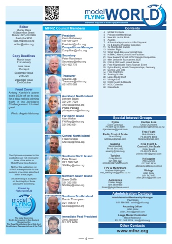 4566791113141621232526293134363841444748MFNZ Council Members ContentsRecording OfficerAllan Knoxallan.j.knox@gmail.comAdministration/Membership Manager Paul Clegg021 986 566 admin@mfnz.orgSpecial Interest GroupsAdministration ContactsPresidentKevin Botherway027 557 0470President@mfnz.orgImmediate Past PresidentChris Jackson021 072 9458TreasurerMaurice JobTreasurer@mfnz.org021 670 689Competitions ManagerCompMan@mfnz.orgSecretaryPeter RandersonSecretary@mfnz.org Far North IslandAlan WalkerFNIRep@mfnz.org021 943 651Auckland North IslandBehram Bajan021 241 7921 ANIRep@mfnz.orgPrime Personprimeperson@mfnz.org Central North IslandFrazer BriggsCNIRep@mfnz.orgSouthern South IslandDarrin Thompson021 766 914SSIRep@mfnz.orgSouthern North IslandPete Brown 021 399 548SNIRep@mfnz.orgNorthern South IslandDave Griffin021 352 595NSIRep@mfnz.org www.mfnz.org021 452 778PylonDave ColemanPh 021 0241 2589djacoleman@gmail.comRadio Control ScaleGrant Finlaynzfinlays@gmail.comSoaringDavid JamesPh 06 354 3452soaring@mfnz.orgTurbineCraig Abbott021 886 222president@NZJMA.comFPV & MultirotorsMathew Wellingtonmat_wellington@yahoo.co.nzControl LineChris Chamberschris.chambers@hotmail.co.nzFree FlightRob WallacePh 06 878 4993ffonzrjw@gmail.comFree Flight & Control Line ScaleRicky BouldPh 09 478 8949unimec1994@gmail.comHelicopterAllen James027 580 5630allenjames@orcon.net.nzVintageAllan Knox021 747 950allan.j.knox@gmail.comAerobaticsFrazer Briggs021 288 9455frazer@pbgsoftware.co.nzLarge Model ControllerRene RedmondPh 021 245 2729 lmc@mfnz.orgMFNZ ContactsPresidential RamblingsNew Kid on the BlockAwardsA Practical Approach to LiPo DisposalIC & Electric Propeller SelectionTx Throttle Kill SwitchMaiden FlightWhat Wind does your Aircraft SeeNSMAC New Control Line FacilitiesNew Zealand%u2019s First GPS Triangle Competition46th Jerilderie Tournament 2025F3K & F5K North Island SeriesFree Flight Scale Trans Tasman EventPylon Racing World Championships, GermanyControl Line SIGFree Flight SIGSoaring ScribeLarge Model StuffVintage SIGNDC Report & ResultsNDC CalendarClassifiedsOther ContactsThe Opinions expressed in this publication are not necessarilythose of the editor or Model Flying New Zealand.Neither this publication nor MFNZ are responsible for the contents or services advertised within these pages.All advertising is accepted on the integrity of those placing the advertising.Printed byFisherprint LtdThe body Governing Model Aeronautics in New ZealandRecognised by The Royal New Zealand Aero Club (Inc)New Zealand Representatives of the F.A.Ieditor@mfnz.orgEditorMurray Race6 Stevenson StreetMobile: 027 418 0969Balclutha 9230race.m@xtra.co.nzCopy DeadlinesMarch Issue31st JanuaryJune Issue23rd AprilSeptember Issue24th JulyDecember Issue23rd OctoberFront Cover4Antony Koerbin's power scale BE2e off on its way for a slow realistic winning flight in the Jerildarie Challenge event. It looked great.................................Photo: Angela Mahoney
