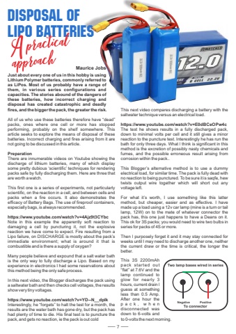 DISPOSAL OF LIPO BATTERIES7Just about every one of us in this hobby is using Lithium Polymer batteries, commonly referred to as LiPos. Most of us probably have a range of them, in various series configurations and capacities. The stories abound of the dangers of these batteries, how incorrect charging and disposal has created catastrophic and deadly fires, and the bigger the pack, the greater the risk.All of us who use these batteries therefore have %u201cdead%u201d packs, ones where one cell or more has stopped performing, probably on the shelf somewhere. This article seeks to explore the means of disposal of these batteries. Incorrect charging and fires arising from it are not going to be discussed in this article. PreparationThere are innumerable videos on Youtube showing the discharge of lithium batteries, many of which display some pretty dubious %u2018scientific%u2019 techniques for rendering packs safe by fully discharging them. Here are three that are worth a watch.This first one is a series of experiments, not particularly scientific, on the reaction in a cell, and between cells and packs when a fire occurs. It also demonstrates the efficacy of Battery Bags. The use of fireproof containers, especially bags, is always recommended.https://www.youtube.com/watch?v=4Ajz9t3CYbcNote in this example the apparently soft reaction to damaging a cell by puncturing it, not the explosive reaction we have come to expect. Fire resulting from a Lipo failure, on DISCHARGE is mostly about the pack%u2019s immediate environment; what is around it that is combustible and is there a supply of oxygen?Many people believe and expound that a salt water bath is the only way to fully discharge a Lipo. Based on my experience in electronics I had some reservations about this method being the only safe process. In this next video, the Blogger discharges the pack using a saltwater bath and then checks cell voltages, the results show very tiny voltages.https://www.youtube.com/watch?v=YD--N__dpIkInterestingly, he %u201cforgets%u201d to halt the test for a month, the results are the water bath has gone dry, but the pack has had plenty of time to die. His final test is to puncture the pack, and gets no reaction, ie the pack is out coldThis next video compares discharging a battery with the saltwater technique versus an electrical load.https://www.youtube.com/watch?v=E0dBCeOPw4cThe test he shows results in a fully discharged pack, down to minimal volts per cell and it still gives a minor reaction to the puncture test. Interestingly he has run the bath for only three days. What I think is significant in this method is the excretion of possibly nasty chemicals and fumes, and the possible erroneous result arising from corrosion within the pack..This Blogger%u2019s alternative method is to use a dummy electrical load, for similar time. The pack is fully dead with no reaction to being punctured. To be sure it is saqfe, hew twists output wire together which will short out any voltage left.For what it%u2019s worth, I use something like this latter method, but cheaper, easier and as effective. I have made up a load using a 12v car lamp (mine is a turn or tail lamp, 12W) on to the mate of whatever connector the pack has, this one just happens to have a Deans on it. This ok for 3S packs; you would need to wire two bulbs in series for packs of 4S or more.Then I purposely forget it and it may stay connected for weeks until I may need to discharge another one, neither the current draw or the time is critical, the longer the better. This 3S 2200mAh pack started out %u201cflat%u201d at 7.6V and the lamp continued to glow for nearly 3 hours, current drain I guess at something less than 0.5 Amp. After one hour the p a c k , w h e n disconnected was down to 6-volts and Two lamp bases wired in seriesTo connectorNegative Positiveto 0-volts the next morning. Maurice Jobs