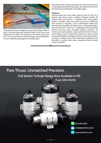 I checked the pack voltage and got 0.6V off load. After 3 days, I disconnected the lamp and left it for 24 hours and measured the cells; the reading for the whole pack was 0.6V. I have put it back on the discharge lamp indefinitely, or until I need the lamp again for another packOne thing worth noting is that the pack may well puff up (if not already) during this discharge, this seems to be minor and if the pack is left dead, it subsides again.DisposalHaving made your pack safe, what do you do with it? It seems most towns have a battery disposal facility. All should offer this function, I disagree with using public waste or landfill, there are metal resources in batteries that should be recycled. I live in Palmerston North and recently took a number of model Lipos, a lead acid battery and even the 57V Lipo from a Segway to the Recycling Centre and they were accepted without question, so check your local situation. I personally think that for every ones%u2019 safety, Lipos in particular, should be made as safe as possible before we dispose of them, there have been a number of rubbish truck fires attributed to batteries and the effort to render them safe, especially lithium based ones, is minimal.8